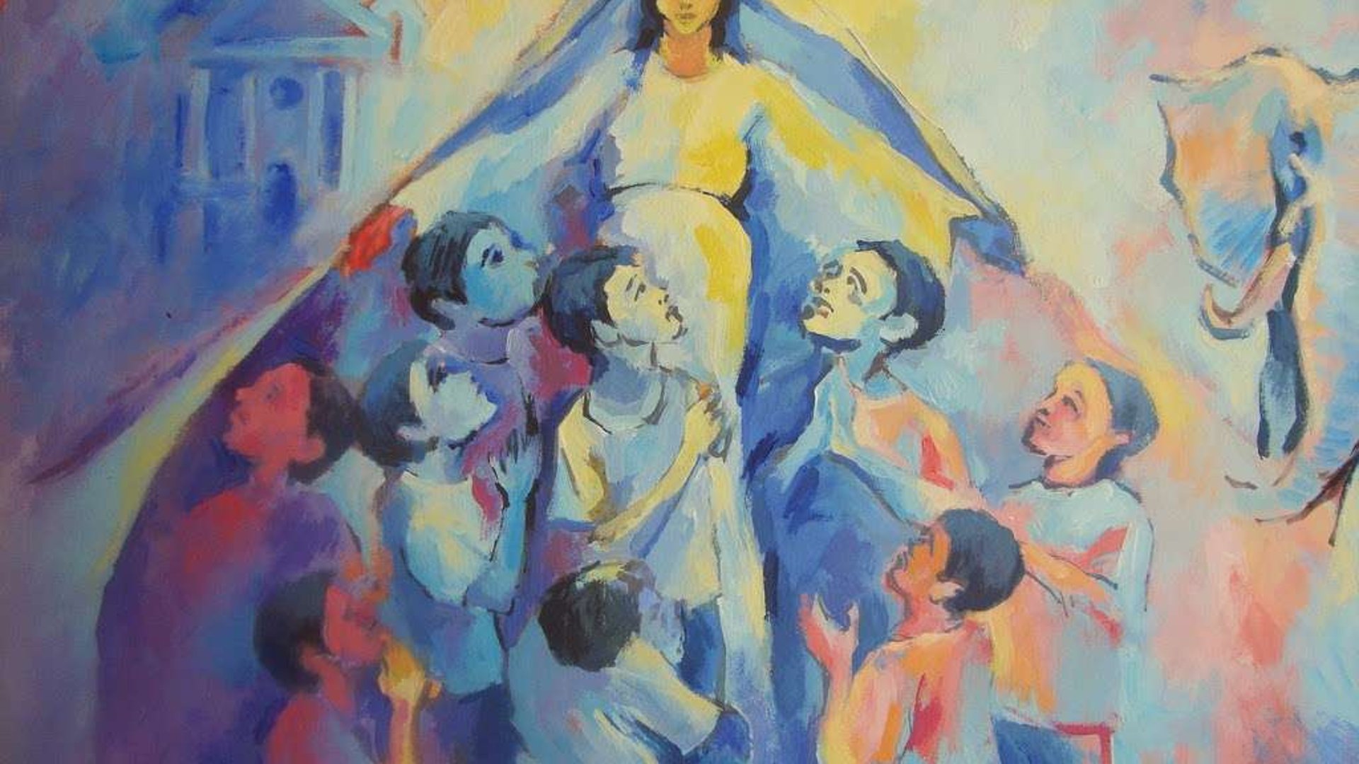 Dall’altra parte la scena dolcissima della Vergine che, ai giovani ricoverati sotto il suo manto, rivolgeva belle parole di conforto e di speranza. Tra le altre, Don Bosco udì queste: