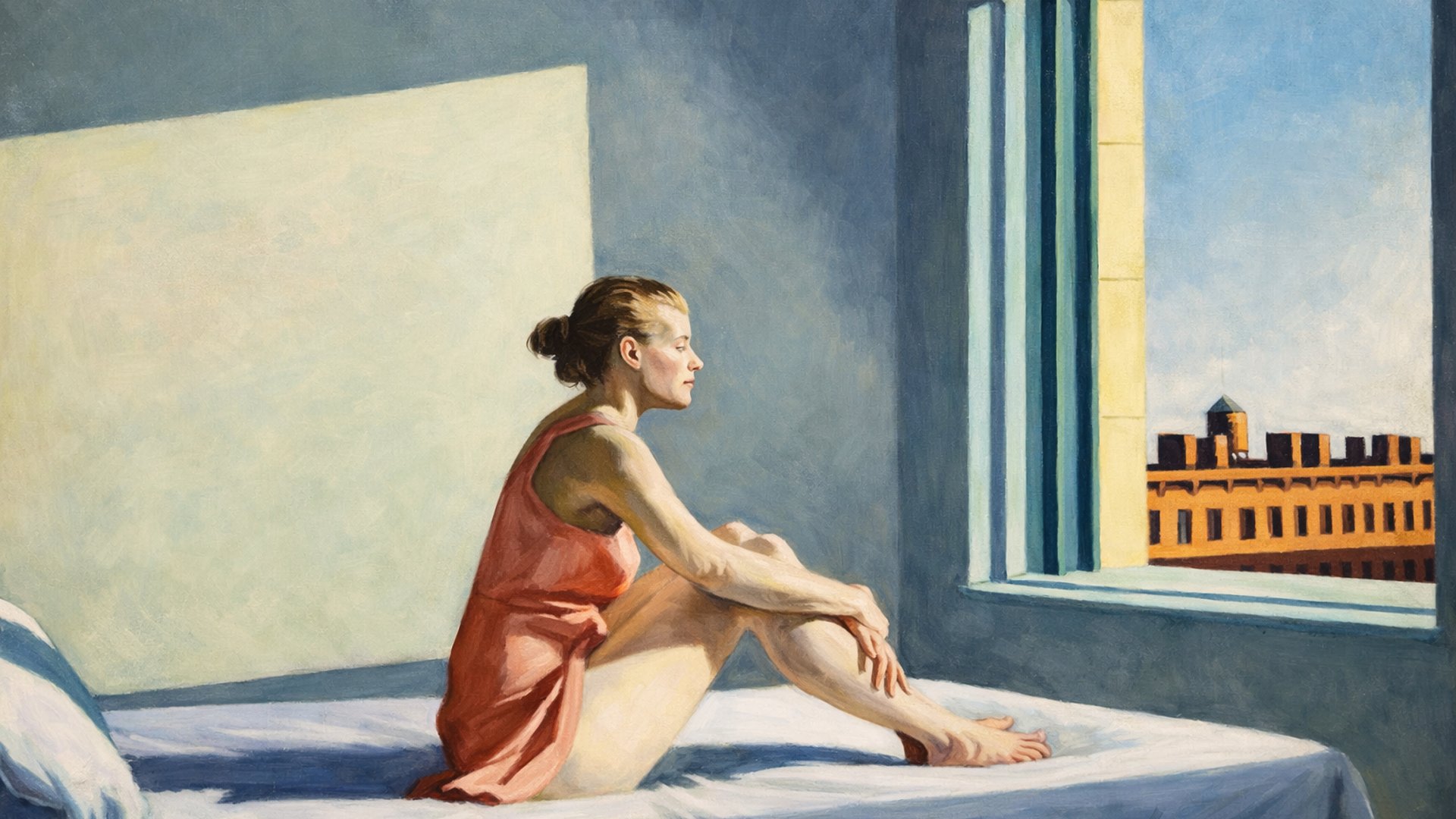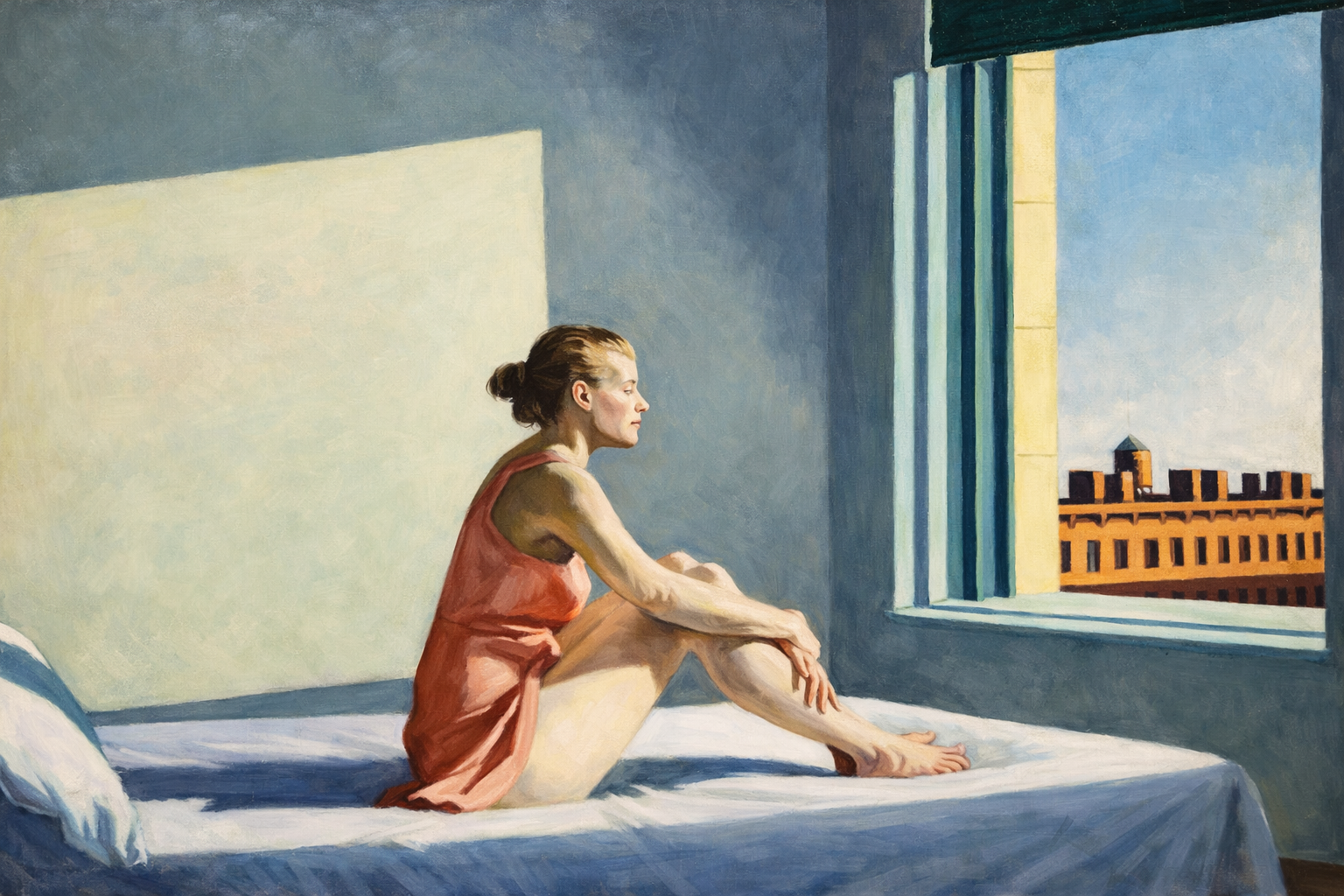 In un altro dipinto, “Morning Sun”, una giovane donna è seduta sul letto, lo sguardo rivolto verso un riquadro di luce che sembra arrivare da molto lontano. Il suo corpo è fermo, ma il suo pensiero è in viaggio. È un’immagine che parla a chiunque si sia trovato a fare i conti con il proprio futuro, con scelte non facili, con la fatica di crescere. È come se Hopper dicesse: “Non devi correre. A volte basta restare, e lasciare che la luce ti raggiunga.”